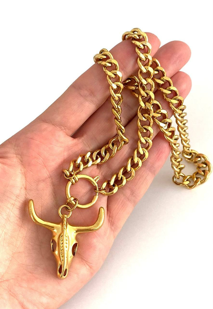 This gold necklace with a bull skull pendant embodies strength and courage. Exquisite craftsmanship and attention to detail make this accessory a true work of art. The “Bull Totem” necklace is a perfect addition to both everyday looks and special occasion outfits, drawing admiring glances and highlighting your individuality.