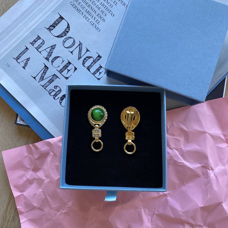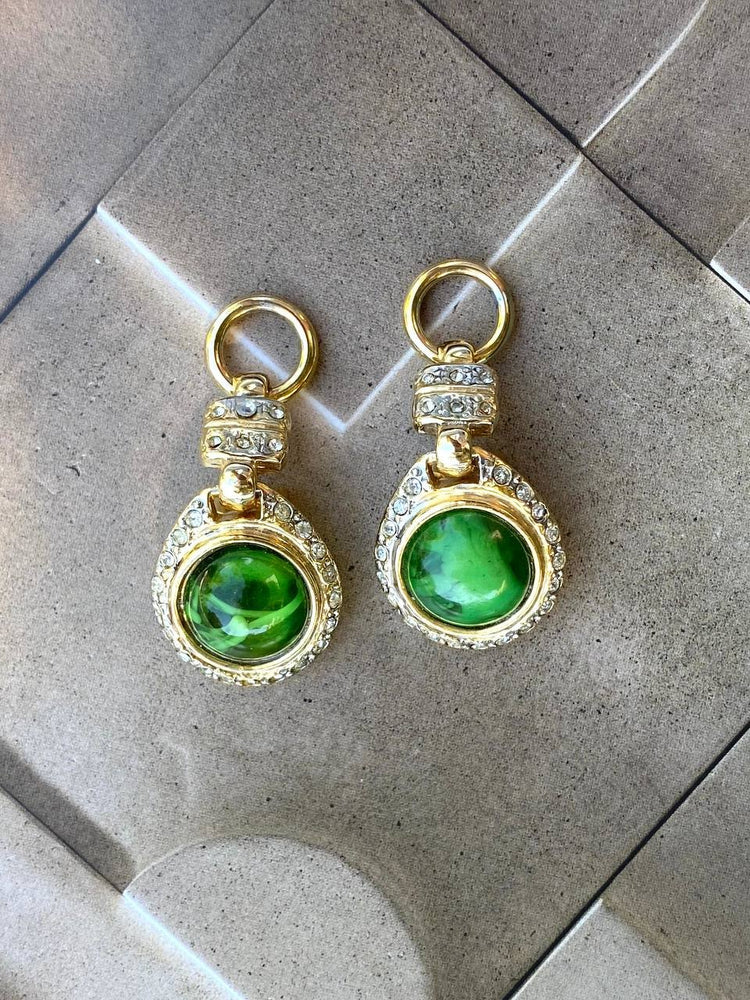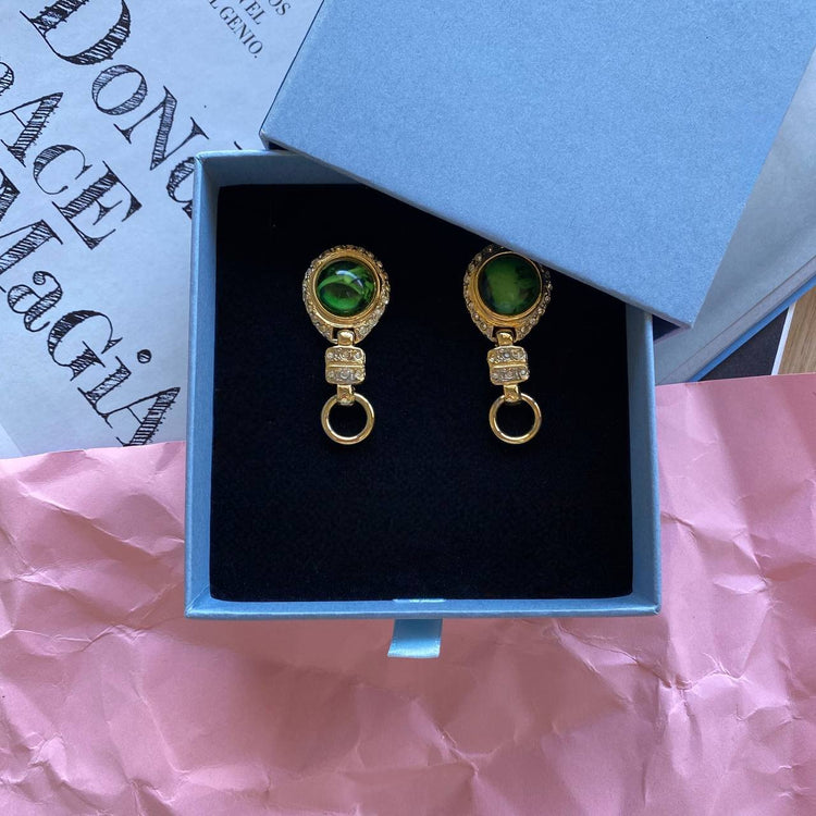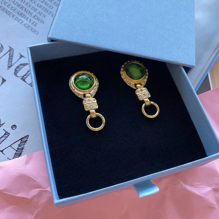 These vintage earrings embody the spirit of adventure and the grandeur of treasures. A unique stone resembling an emerald shines surrounded by sparkling crystals framed in gold. Exclusive jewelry will add brightness to any image, bringing a touch of luxury and uniqueness. In ancient legends, emeralds personified strength and mysticism, and gold symbolized wealth and eternity. These earrings are like a reflection of lost treasures that were once kept at the bottom of the seas.