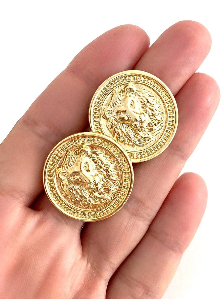 Gold plated costume jewelry earrings embody strength and grace. The embossed lion patterns symbolize courage and royal majesty, giving the earrings a unique charisma. Ideal for those who want to add a touch of nobility and confidence to their image. These earrings are ideal for both business meetings and formal events, emphasizing your personality and style.
