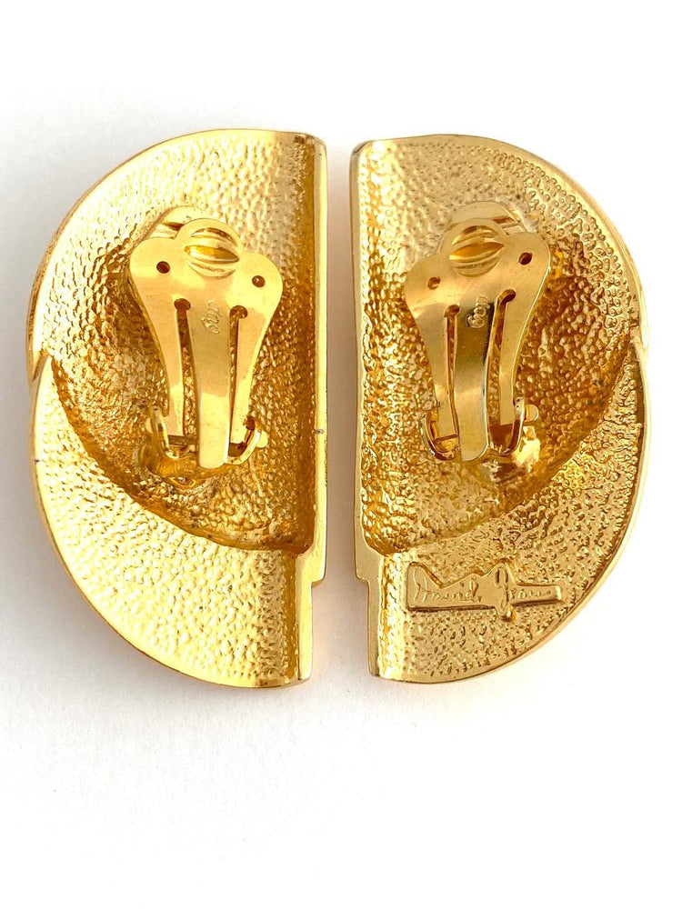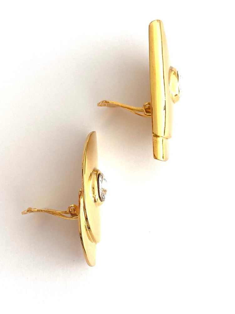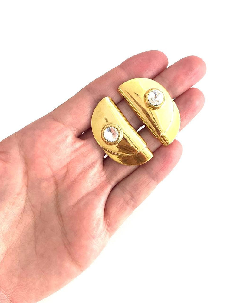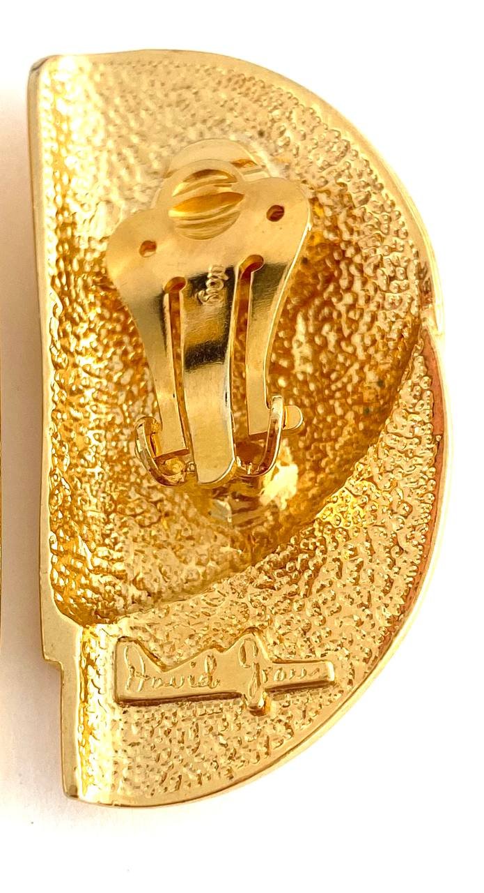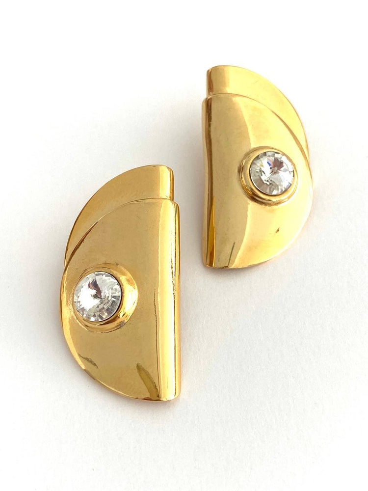 These vintage clip-on earrings by David Grosse are crafted from gold-toned metal and adorned with bright crystals. The unique geometric design and shiny appearance make them the perfect accessory for any outfit. The earrings are comfortable to wear and suitable for everyday use or special occasions.