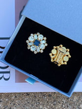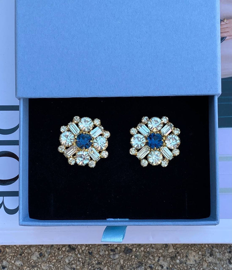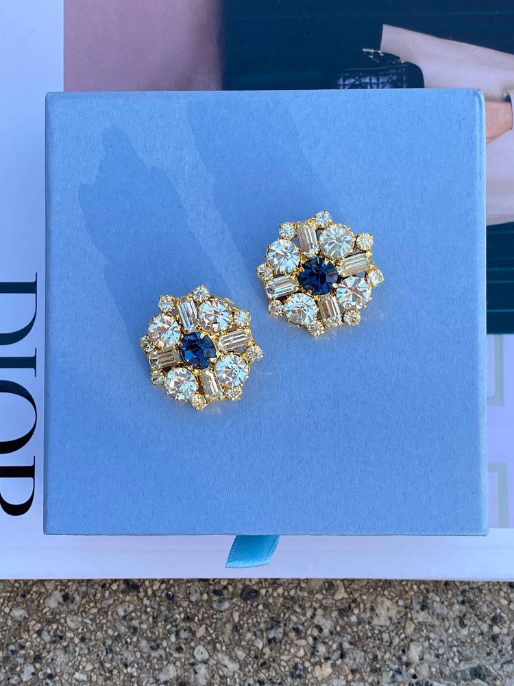 Clip earrings vintage 60-70g. Production Czechoslovakia. Exquisite earrings from Czechoslovakia - a true embodiment of retro-chic. Shimmering large rhinestones of round and rectangular cut frame the central blue crystal, deep and alluring as the ocean. An artful combination of shapes and light creates a mesmerizing sparkle worthy only of you.