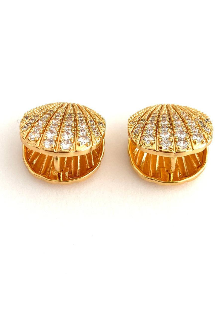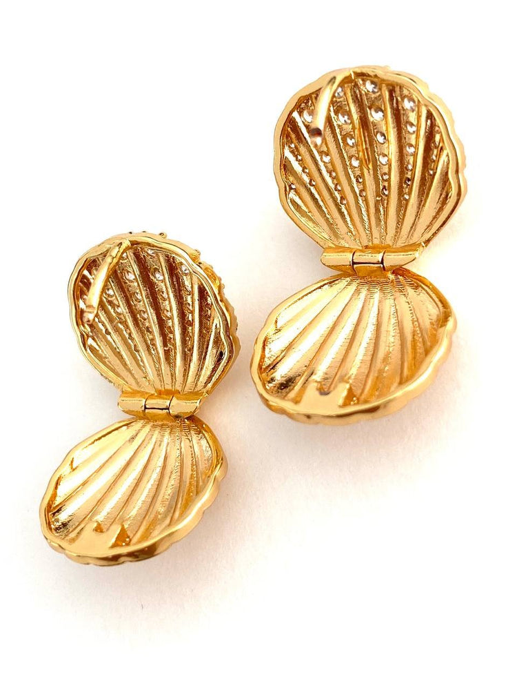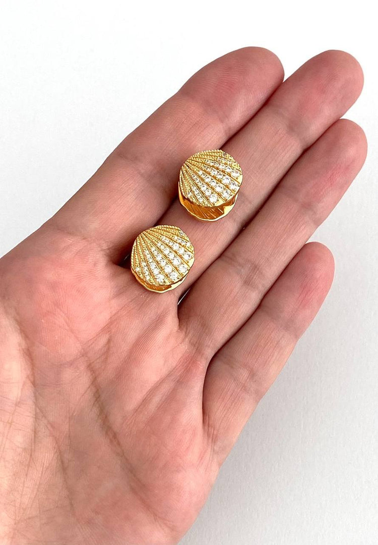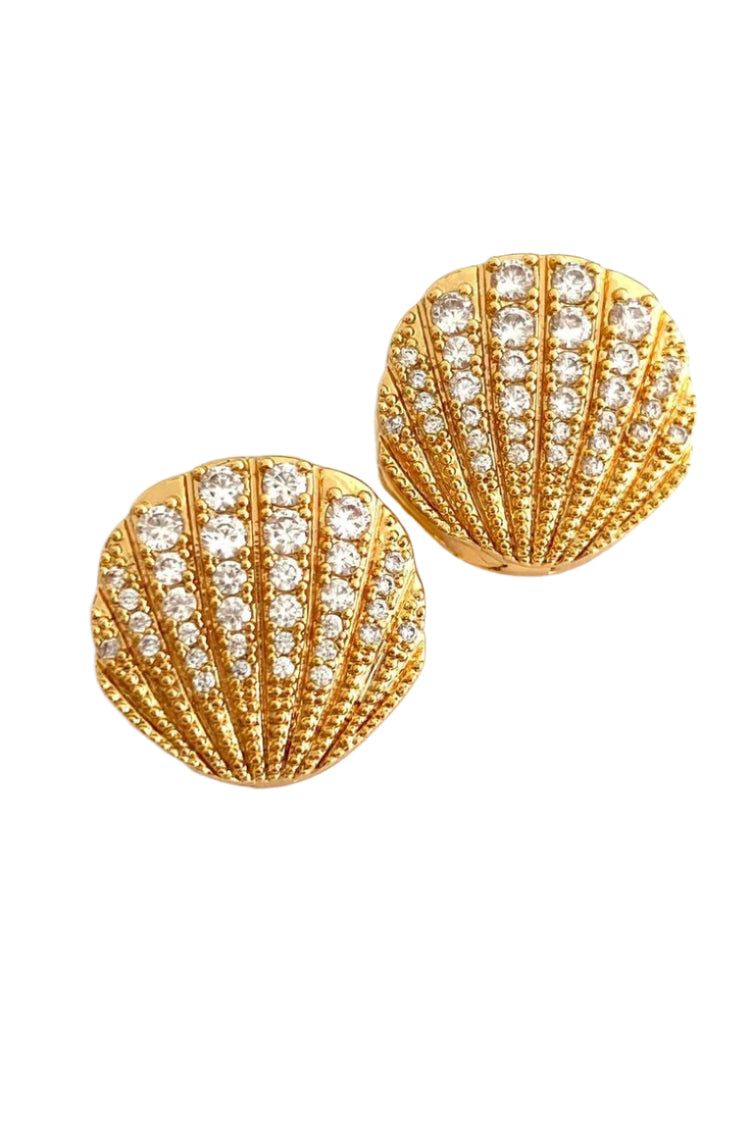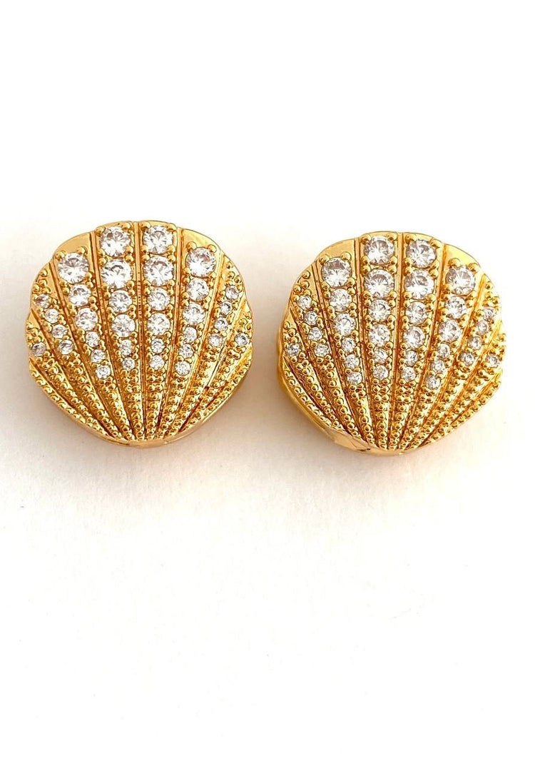 Ocean's Whisper – magnificent gold earrings inlaid with shining crystals. These luxurious shell-shaped pieces embody the sophistication and sparkle of the ocean, adding unparalleled chic to your look.
