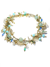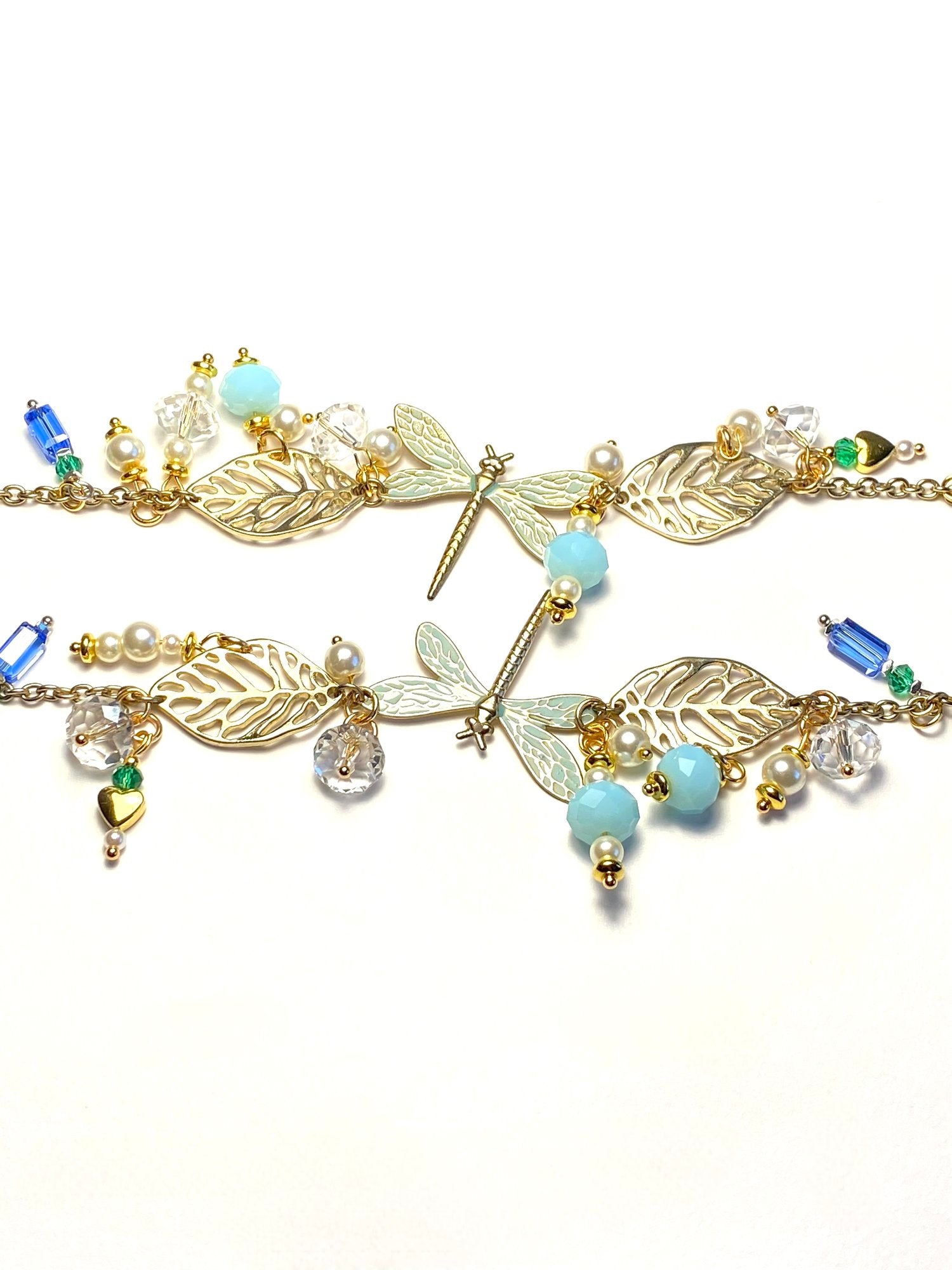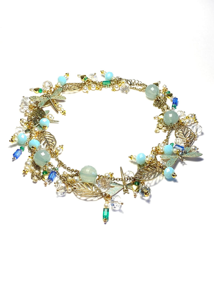 Summer necklace - vintage, 1990 production, consists of many charms, including several dragonflies with wings covered with enamel. Crystal charms alternate around the chains, as well as sapphire and emerald colored charms, pearls and gold accents. Large beads in a delicate azure hue and azure crystal charms framed by pearls give the necklace a delicate sophistication, like dragonflies bathed in sunlight and dew.