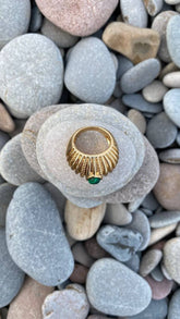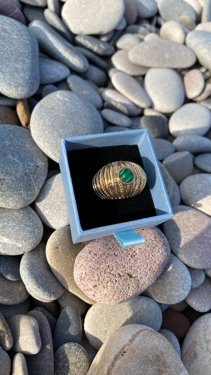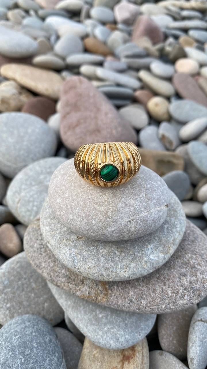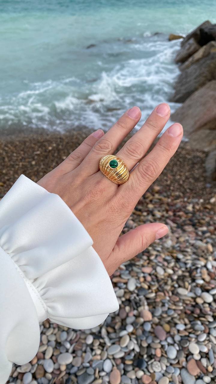 Este anillo encarna la misteriosa grandeza de Oriente. Un enorme anillo de oro, compuesto por tiras y cuerdas entrelazadas, que evoca las llamas parpadeantes del fuego y las líneas sinuosas de los elementos orientales. La malaquita central, como un preciado secreto oculto, añade misterio y elegancia a la pieza. Con este anillo, cada mujer aporta magia y grandeza a su look, sumergiéndose en el mundo de las antiguas leyendas orientales.