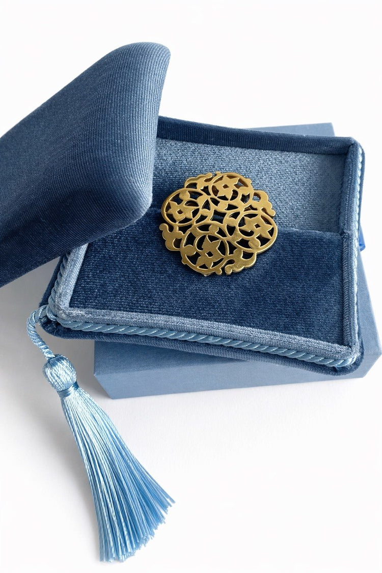 An openwork brooch with an intricate filigree pattern in a warm golden tone. A refined accent for a blazer, coat, or scarf.