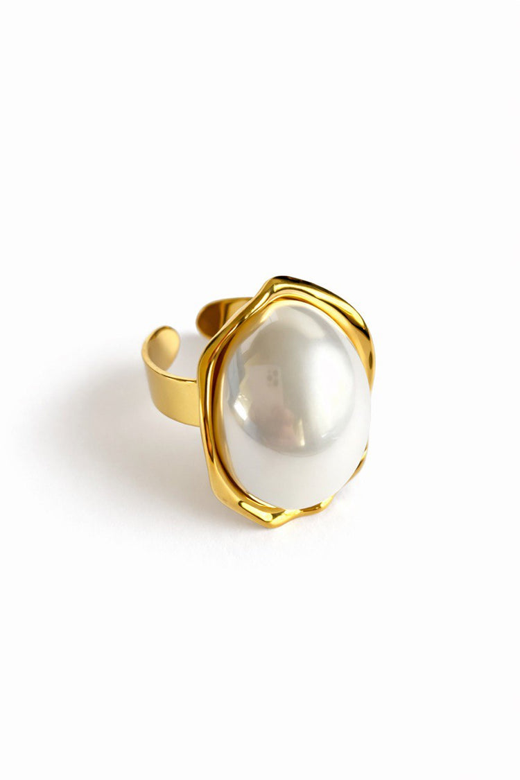 A sculptural statement ring featuring a luminous pearl framed in a soft gold-plated setting. Timeless elegance with a modern edge.