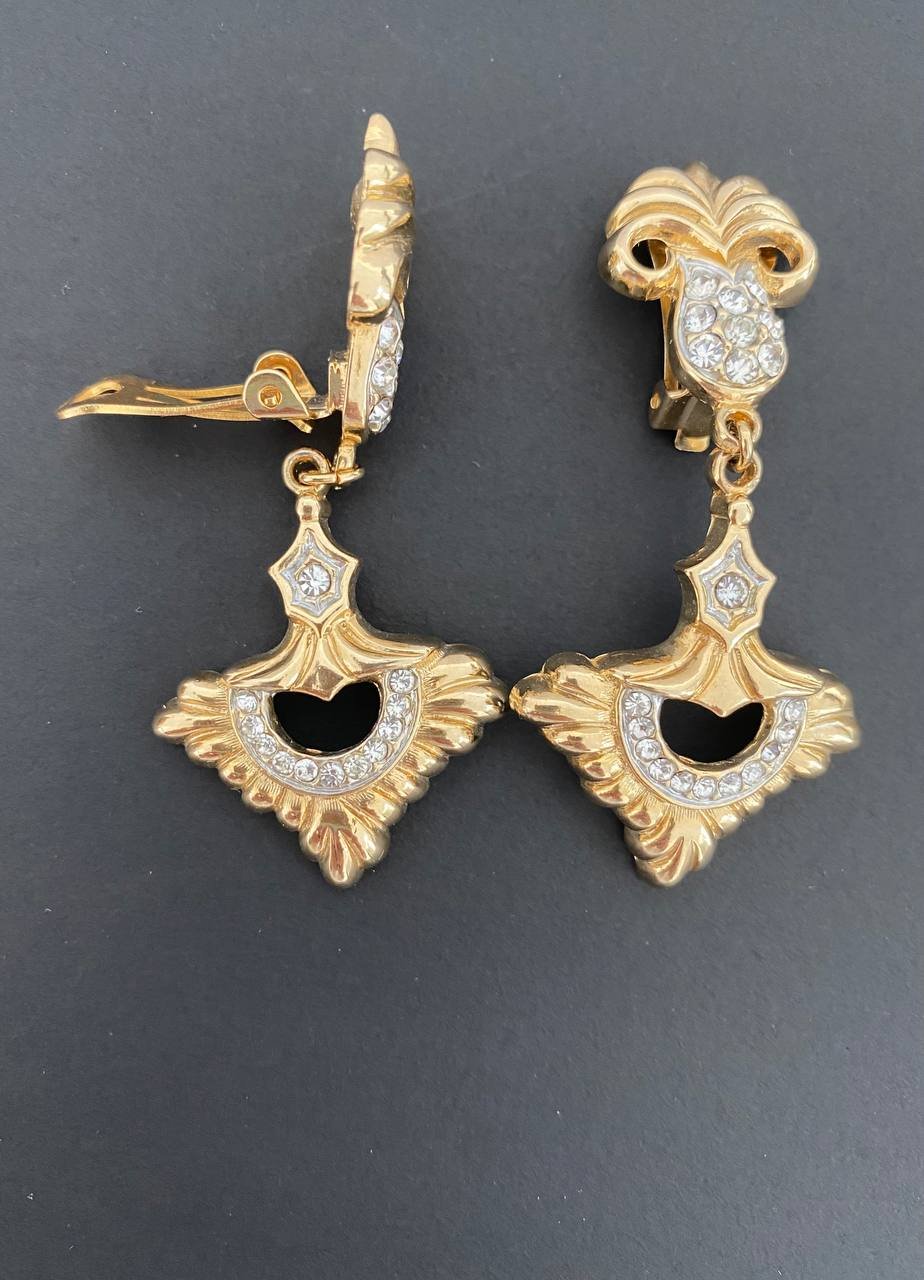 Pendientes vintage muy brillantes con un hermoso diseño inusual. Constan de dos piezas móviles decoradas con 21 cristales brillantes que brillan con la luz. Su cierre es muy cómodo y no pesan. El producto está en perfecto estado, una rareza en la joyería vintage. Las fotos se tomaron con diferentes luces para su comodidad.