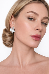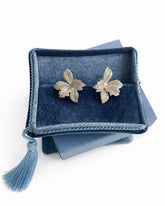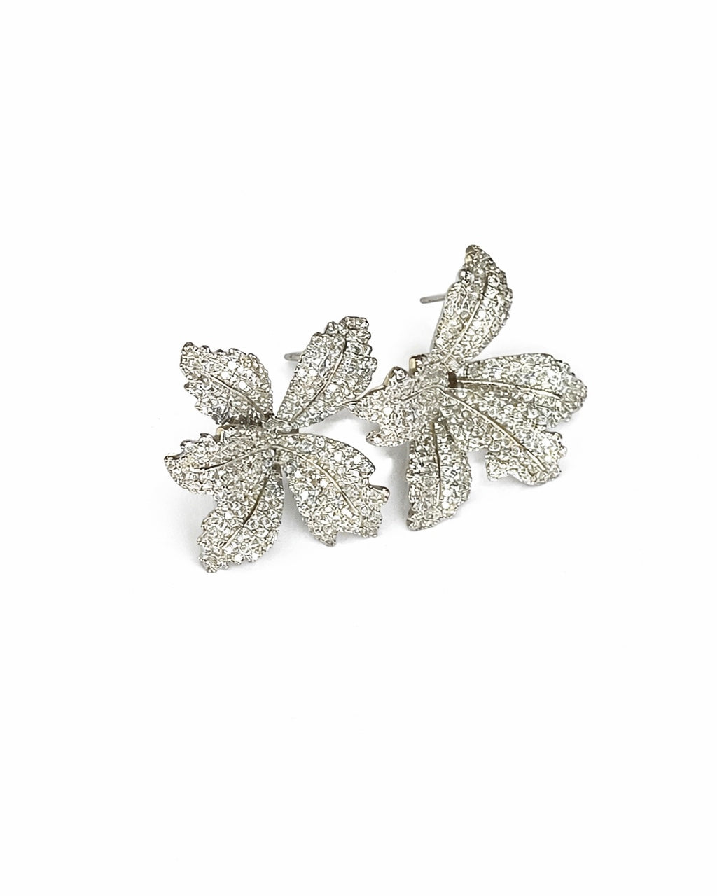 Leaf-shaped earrings fully set with shimmering pavé crystals. A sculptural, nature-inspired design with elegant sparkle in gold or silver tone.