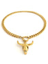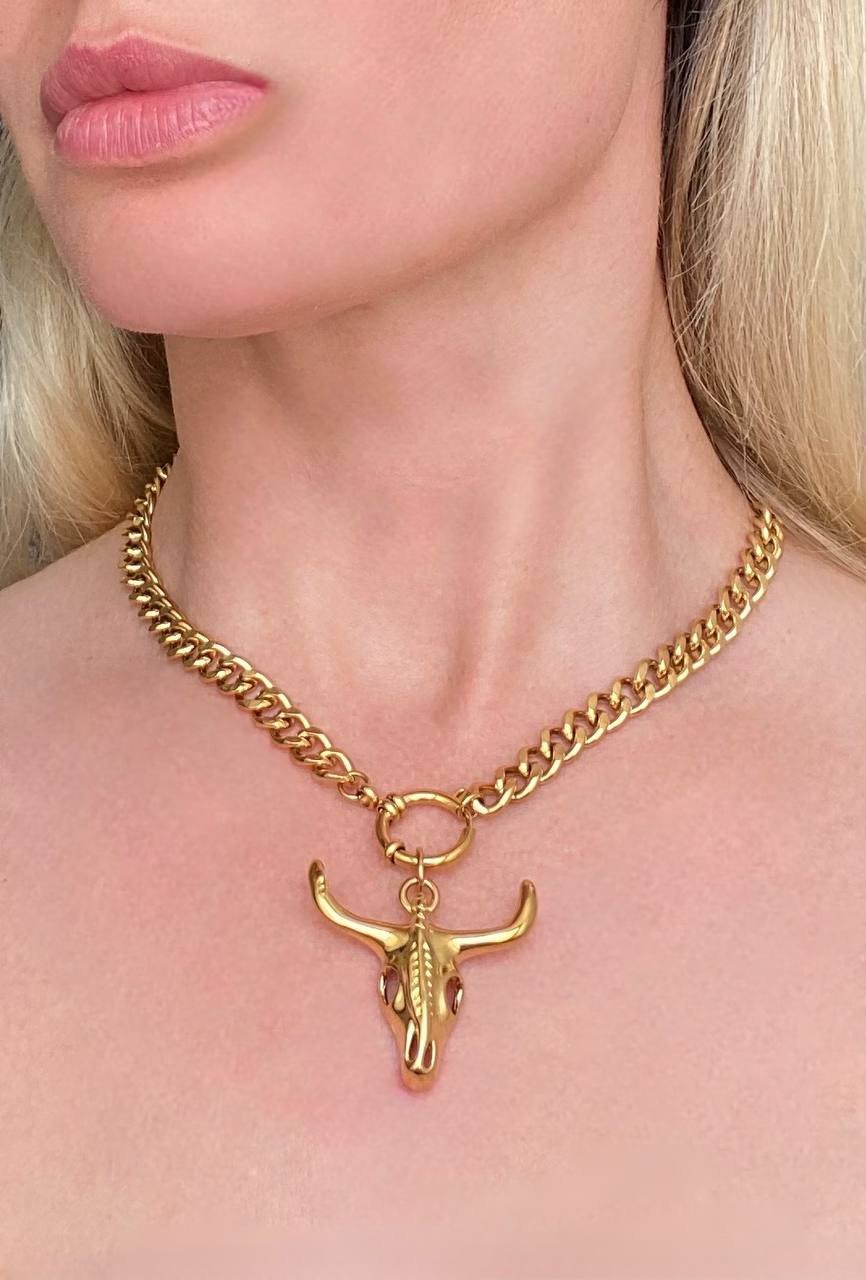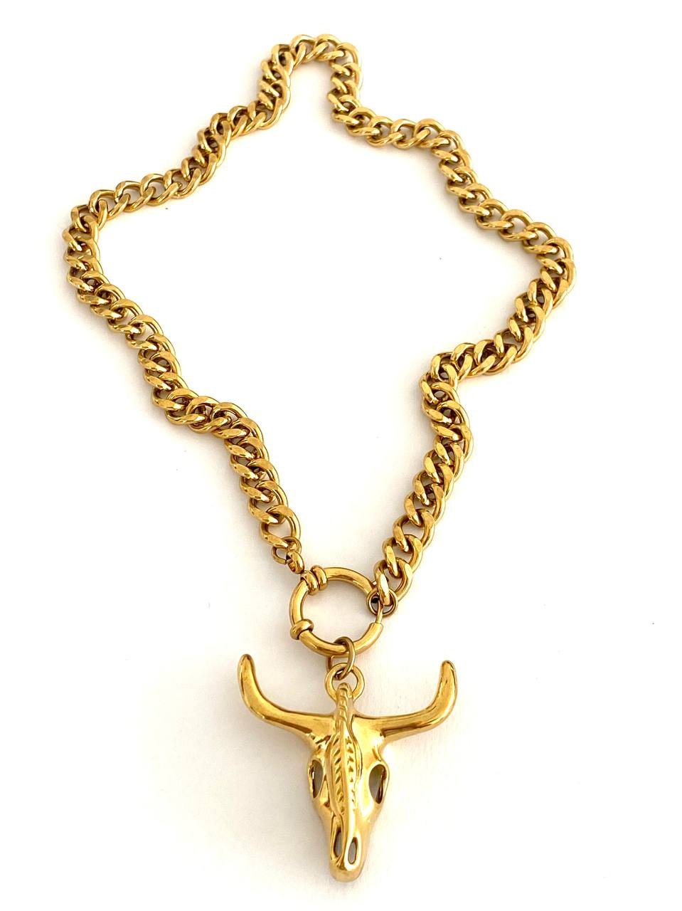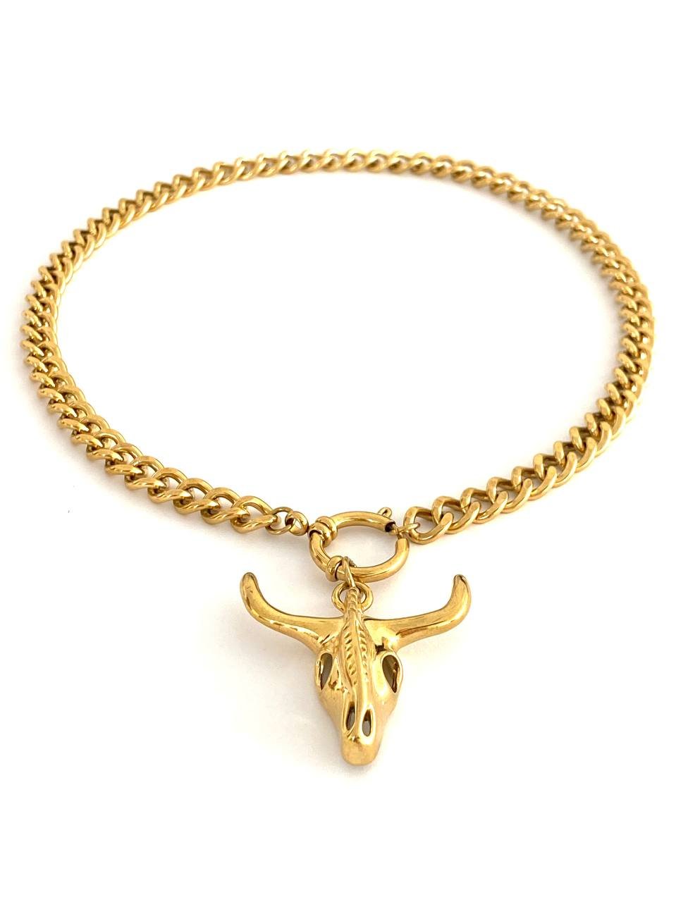 This gold necklace with a bull skull pendant embodies strength and courage. Exquisite craftsmanship and attention to detail make this accessory a true work of art. The “Bull Totem” necklace is a perfect addition to both everyday looks and special occasion outfits, drawing admiring glances and highlighting your individuality.