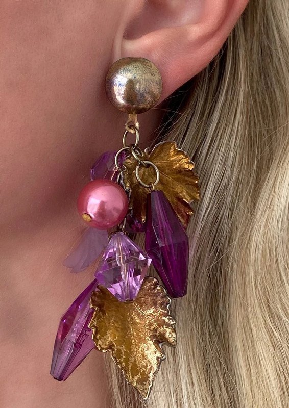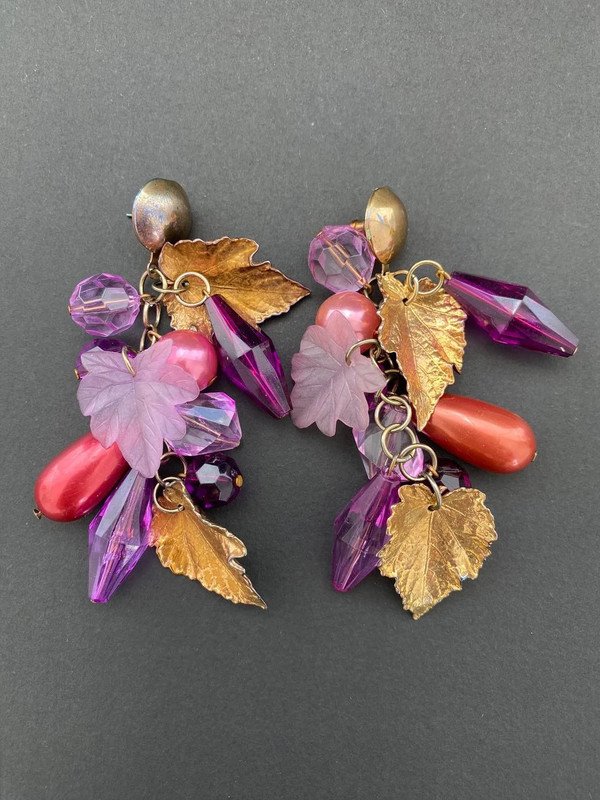 These vintage earrings, released in the 2000s, are a true work of art. Bold and vibrant, they are adorned with movable charms, including large beads, leaves in various shades, and droplets. The naturalistic leaves sparkle in the sunlight, creating a captivating effect. Each detail is movable, giving the earrings a unique shine and dynamism, perfectly suited for bright, romantic girls.