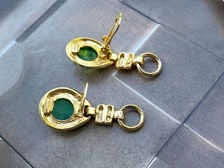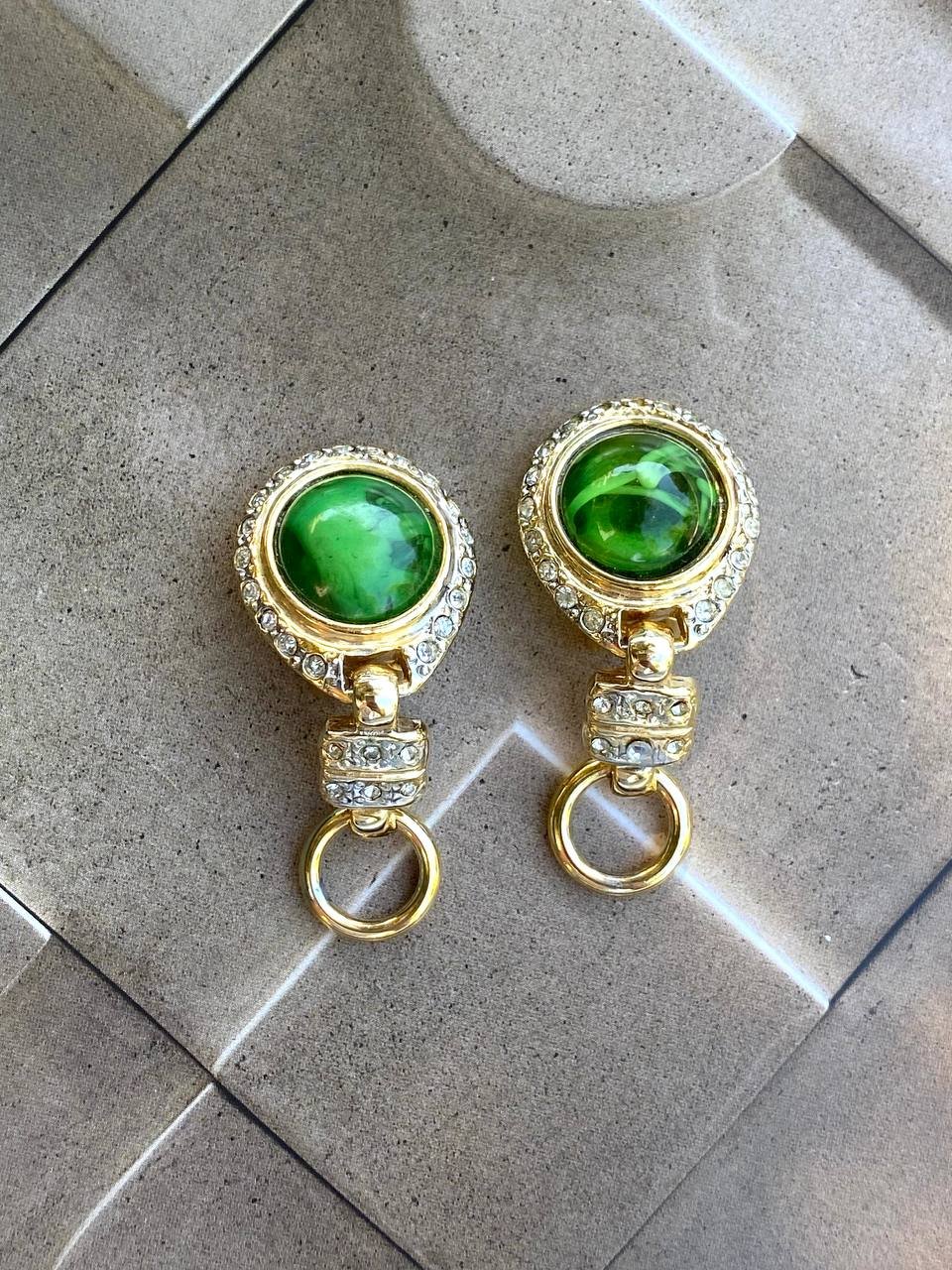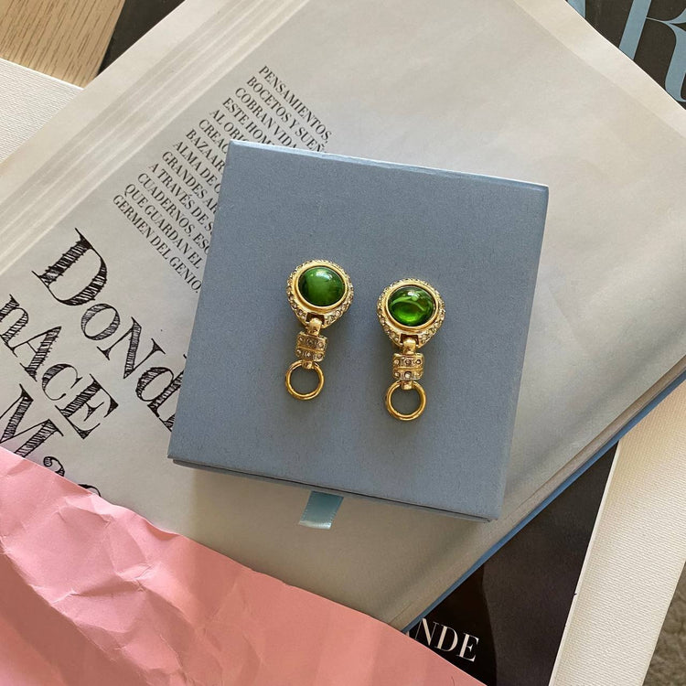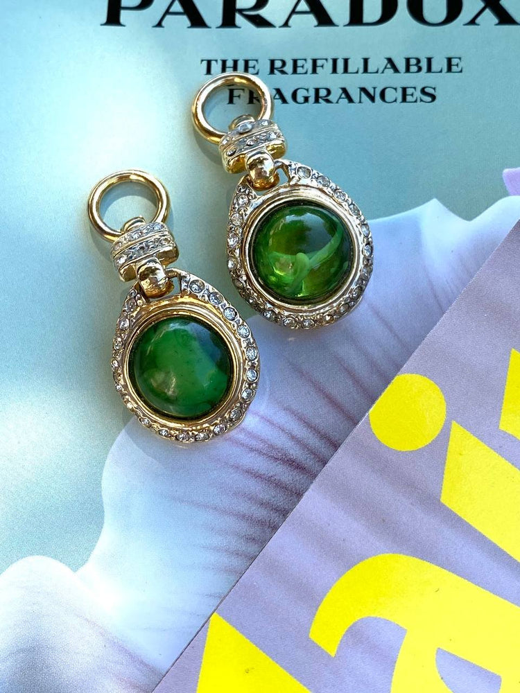These vintage earrings embody the spirit of adventure and the grandeur of treasures. A unique stone resembling an emerald shines surrounded by sparkling crystals framed in gold. Exclusive jewelry will add brightness to any image, bringing a touch of luxury and uniqueness. In ancient legends, emeralds personified strength and mysticism, and gold symbolized wealth and eternity. These earrings are like a reflection of lost treasures that were once kept at the bottom of the seas.