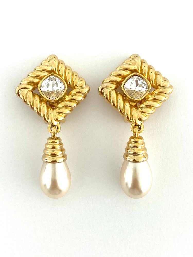 These stunning "Golden Splendor" earrings are the perfect addition to your evening attire. Made from golden metal with a braided effect, they feature sparkling crystals for added brilliance. The earrings are finished with a teardrop-shaped pearl pendant, adding sophistication and elegance. These earrings will bring luxury and shine to any occasion.