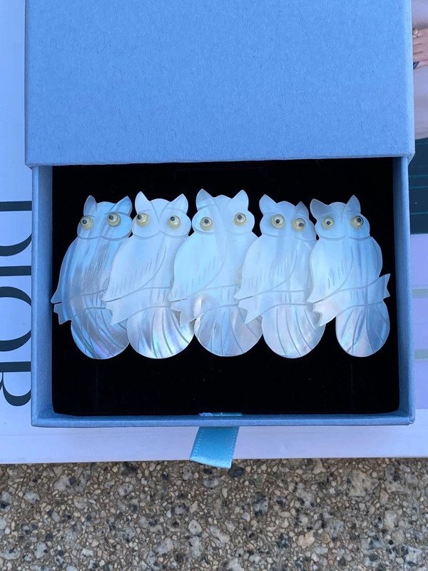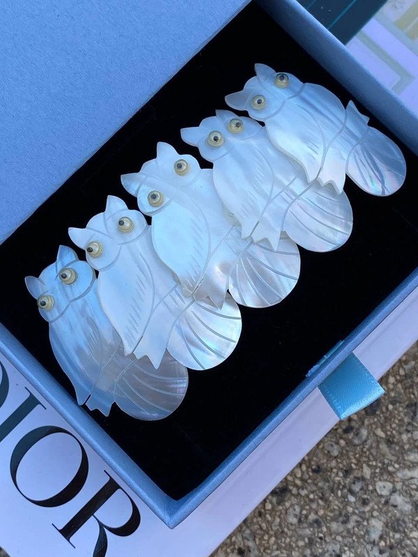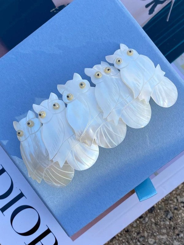 This vintage brooch, handcrafted in the 2000s and brought from Thailand, is a unique work of art. Made of 100% metal and natural mother-of-pearl with intricate owl carvings, it features movable eyes that give it a special character. Perfect for creating elegant hairstyles, it holds the hair in place while adding a mysterious charm to your look.